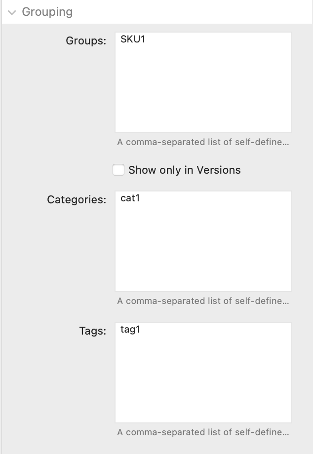 - Added an option 'Show only in Versions' in 'Products', under 'Grouping', attached to 'Groups'. When using groups to create 'Versions', you can now exclude products from the 'Catalog' and have them only show up in the 'Product Versions'-bar.